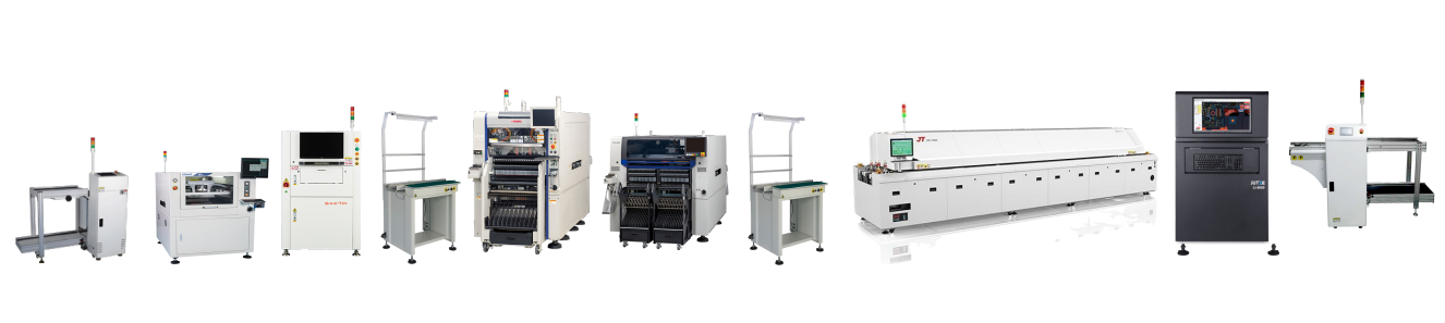 全自動上板機→ 全自動印刷機GKG GSE→思泰克SPI →接駁臺 →YSM40R→ YSM20→ 接駁臺→ 勁拓回流焊→ 矩子在線AOI → 下板機(從左→ 右)