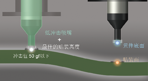 另外,獨家設計的低沖擊吸嘴還能防止錫膏塌陷以及元件開裂。 進行補正,所以可以全速執行極小元件的密間距貼裝