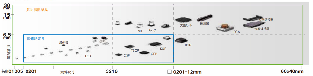 貼裝精度、保證設備高速運行穩定性。 01005微小器件至12*12mm,高度6.5mm 的常
