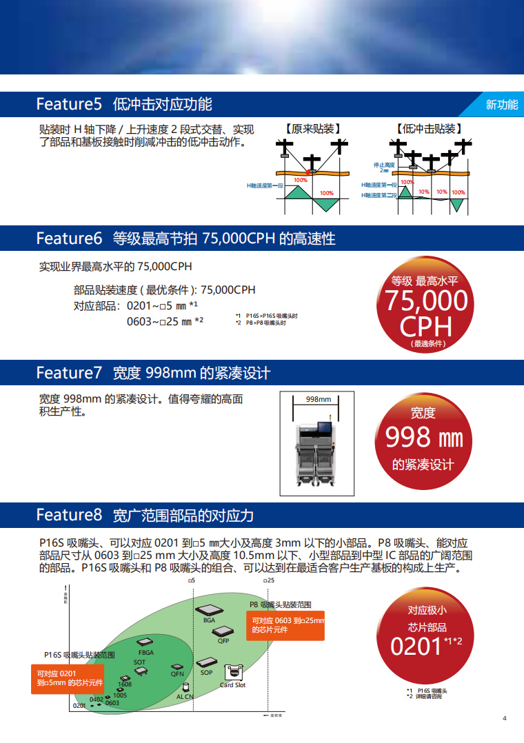 部品貼裝速度 | 芯片部品 | 75,000CPH | 54,900 CPH | 34, 800 CPH | |
